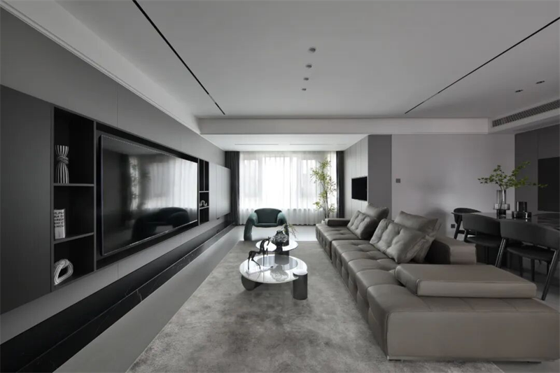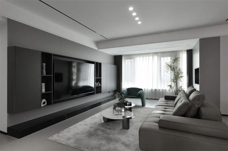 客厅以现代极简风格为基调,整体采用灰黑配色,营造出沉稳内敛的空间气质。电视背景墙采用整面定制柜体设计,深灰色哑光面板与开放式格架结合,嵌入式电视隐藏其中,视觉整洁统一。底部黑色大理石基座提升层次感,兼具装饰与收纳功能。