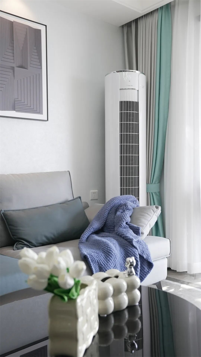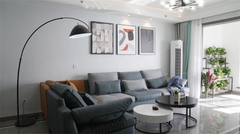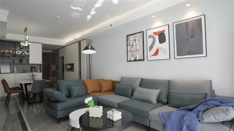 客厅以现代简约风格为基调,巧妙融合功能与美学,营造出舒适而富有格调的生活空间。灰蓝色与暖棕的拼色沙发,既提升了视觉层次感,又带来温暖的居家氛围;搭配圆形金属茶几与黑白撞色设计,简洁而不失设计感。